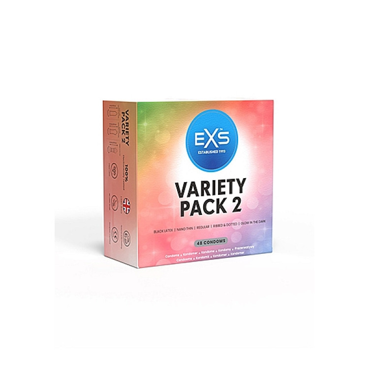 Det er ikke enkelt å velge kondomer, det er da denne pakken kommer inn, pakken inneholder en variasjon av kondomer, 48 kondomer fordelt på tynne, fargede, nupper, riller og kondomer med smak.