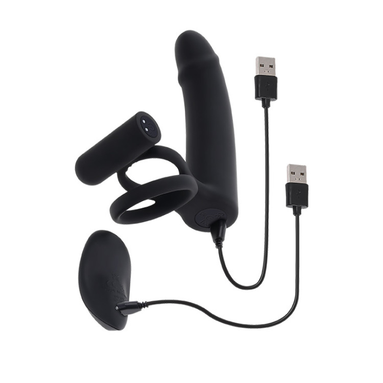 Klar for et dobbelt eventyr? Denne oppsiktsvekkende penisringen kombinerer kraftige vibrasjoner med dobbel nytelse. Den buede dildoen er stiv og målrettet, mens penisringen og ballestroppen er fleksible og behagelige så du kan ha det deilig og stødig på samme tid. Selve dildoen har en kraftig vibrator i seg og i tillegg sitter det en liten, teksturert bullet-vibrator rett ved basen som pirrer partneren din der det virkelig teller.