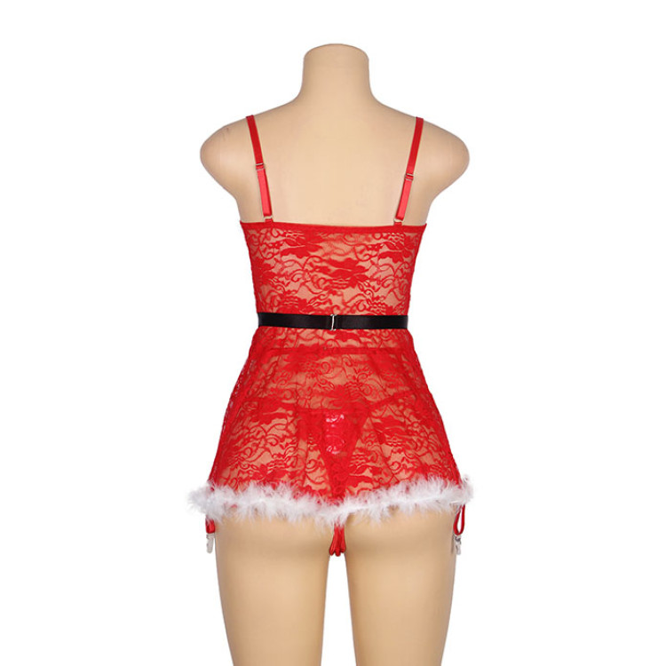 Den hvite fuskepelskanten rundt cupene og i nederkant av kjolen, gir et lekent og juleaktig preg, perfekt til naughty and Nice.