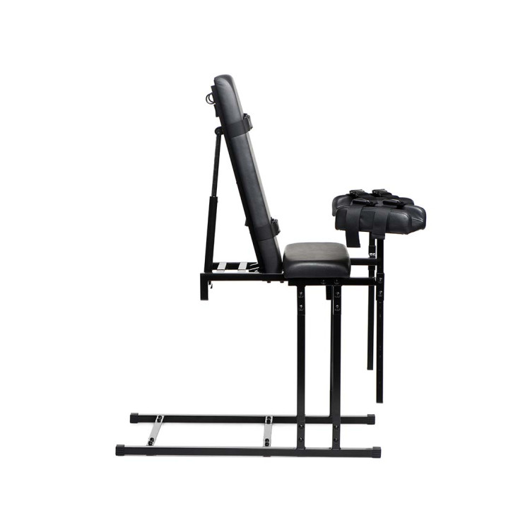 Selve stolen har en heavy-duty ramme som tåler opptil 199kg, med en justerbar rygg slik at du kan plassere din underdanige oppreist slik at de kan se alle dine planer settes i verk, eller len ryggen tilbake slik at kroppen deres slapper av med fri tilgang til deres overkropp til teasing, frekk sanselek eller kjærlig berøring. Fothøyden kan selvfølgelig også justeres, slik at du kan velge om føttene skal stilles høyt eller lavt - alt etter hva som passer dere best.