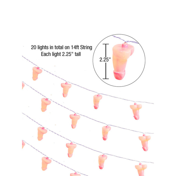 Gjør deg klar til å lyse opp festen med disse morsomme lyslenkene! Disse unike og festlige lyslenkene har 20 penisformede lys som strekker seg over 4,3 meter. Lysene skaper en leken stemning både innenførs og utendørs, og er perfekt til fest!