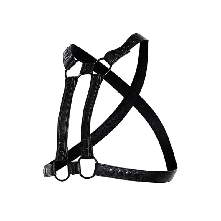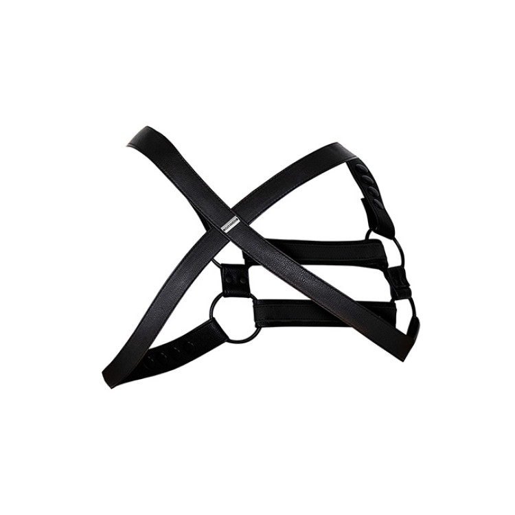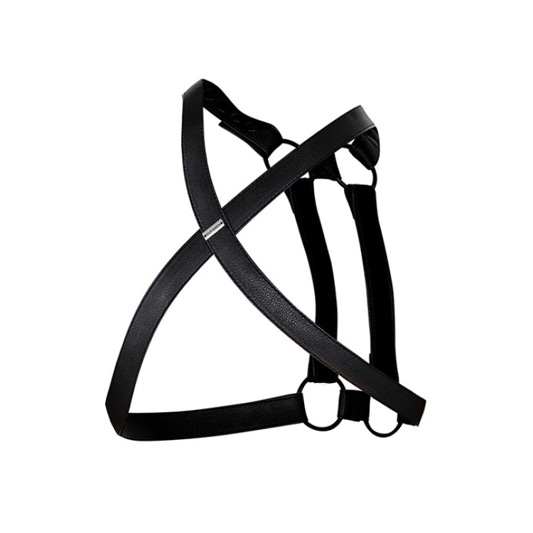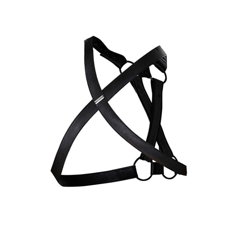 Nøkkelord: H4rness, justerbar harness, CUT4MEN harness, vegansk lær harness, herreharness i vegansk lær, unikt design harness, tilpasningsdyktig harness, 4-veis harness, harness med avtakbare stropper, matte svarte O-ringer