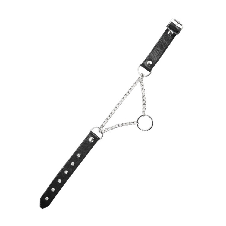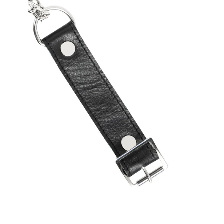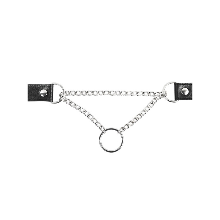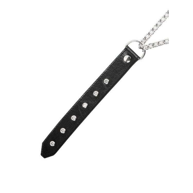 Foran prydes det av en metallkjede med en solid O-ring (30 mm) som er perfekt for å feste bånd, lenker eller annet tilbehør. Baksiden har en justerbar metallspenne som gjør at halsbåndet sitter trygt og komfortabelt, uansett om det brukes som en del av lek eller som et dristig moteelement.